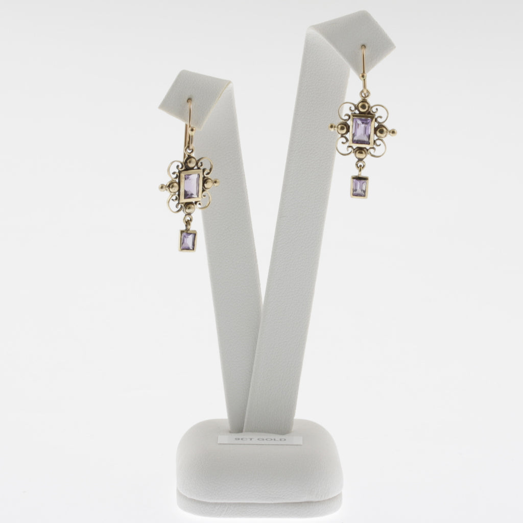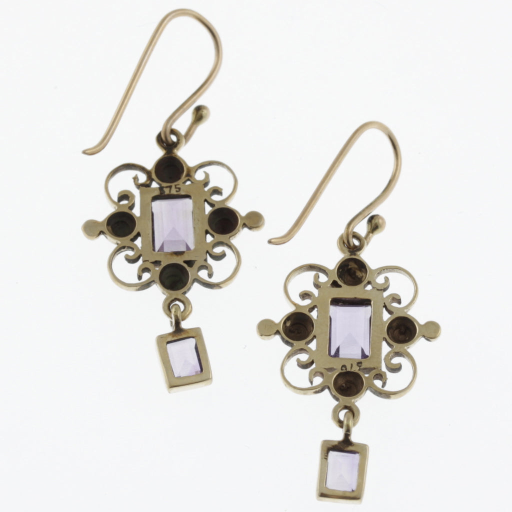 Amethyst yellow gold rectangle detail drop vintage style earrings